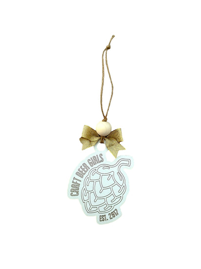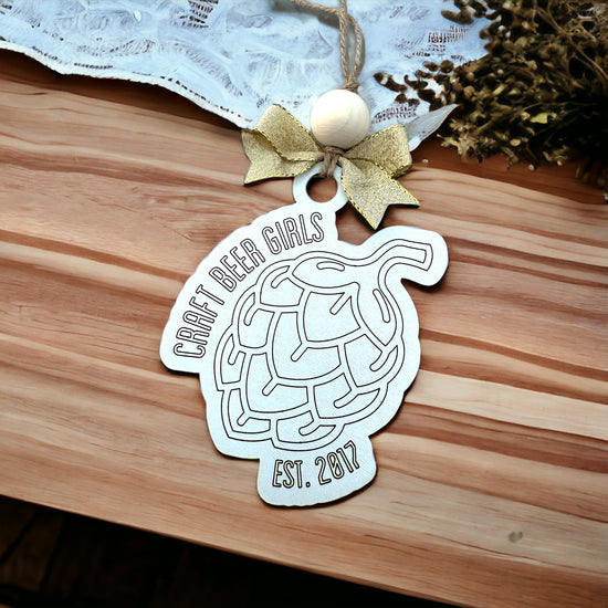Adorned with a sparkling gold bow and a natural wooden bead, it hangs from a rustic twine loop, adding a touch of artisanal charm to your holiday decor. Perfect for beer enthusiasts and members of the Craft Beer Girls community, this ornament not only beautifies your space but also showcases your love for craft beer culture.