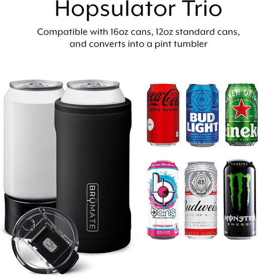 The Brümate Hopsulator TRIO 3-in-1 is the most versatile can cooler in the world, fitting your favorite 16 ounce craft cans and including an adapter for standard 12 ounce cans. Want to skip the can? A quick switch turns this patented 3-in-1 cooler into a 16 ounce pint glass. The Hopsulator TRIO keeps beverages 20 times colder than standard can coolers without any messy condensation. Featuring BevGuard™ technology, your drinks stay icy-cold without the metallic aftertaste.