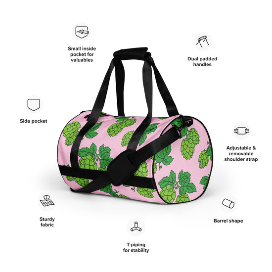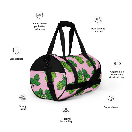 Ready to get your fitness on? Add some punch to pumping iron with this all-over print gym bag. Made from 100% polyester and sturdy, water-resistant fabric, this bag is fun meets function. And it’s got pockets!