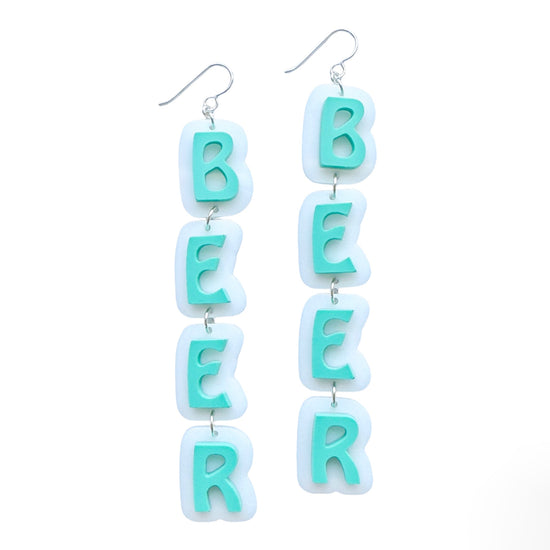 Elevate your accessory game with these vibrant Turquoise "BEER" Dangle Earrings. Each earring features turquoise letters that spell out "BEER", strung vertically to make a playful yet chic statement. Made with sterling silver components, their unique design and soft color palette make them a perfect conversation starter. Handcrafted and lightweight, they sway gently as you move, bringing attention to their delightful design. Whether you're attending a craft beer tasting or looking for a quirky addition to your ensemble, these earrings are the perfect blend of whimsy and style. Let your love for beer shine through with every turn of your head! 🍻